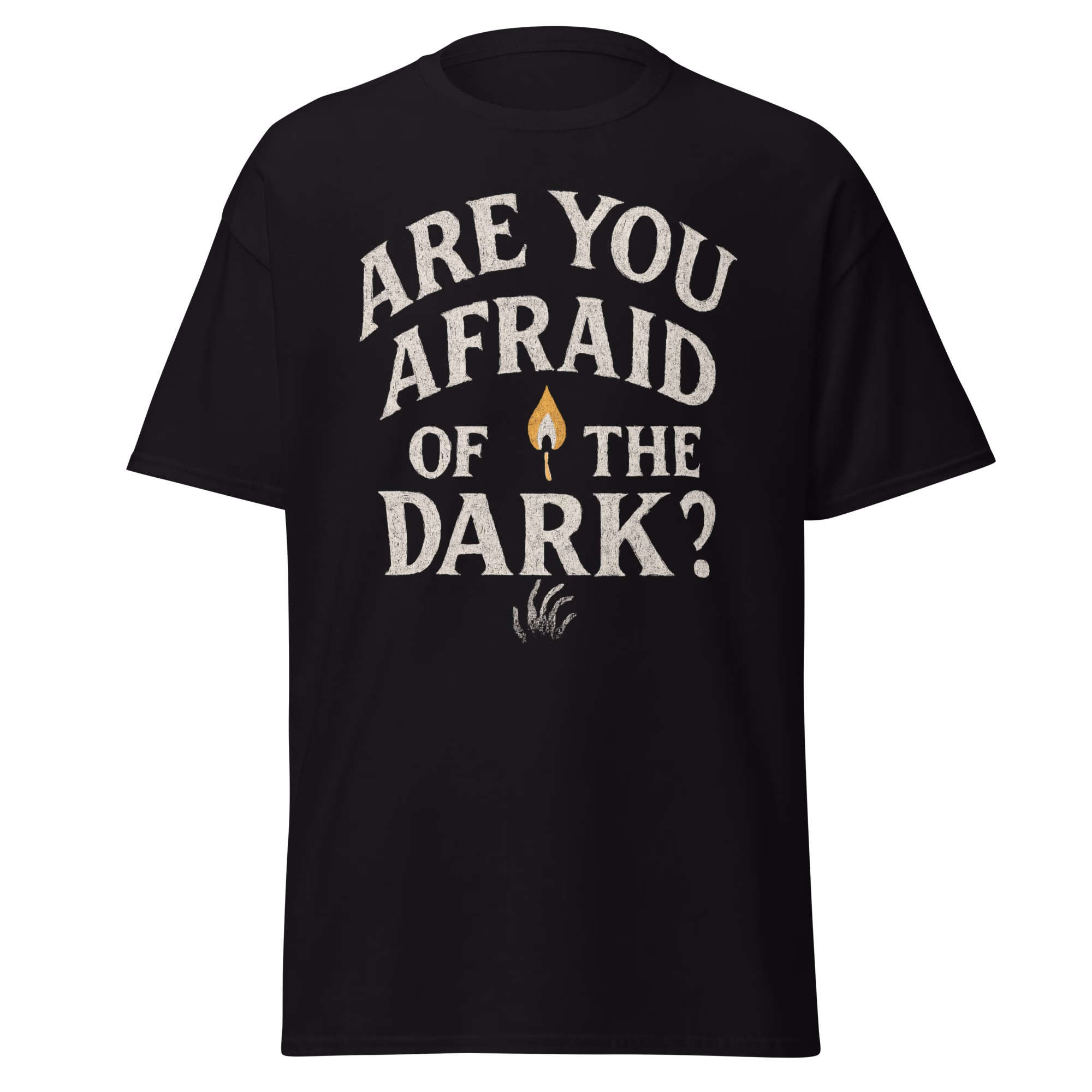 This Are You Afraid of the Dark T-Shirt features a bold, distressed design with the phrase Are You Afraid of the Dark? accented by a glowing match and eerie hand detail. Perfect for fans of classic spooky nostalgia, this shirt pops with high-contrast lettering on black and navy tees for a hauntingly stylish look.