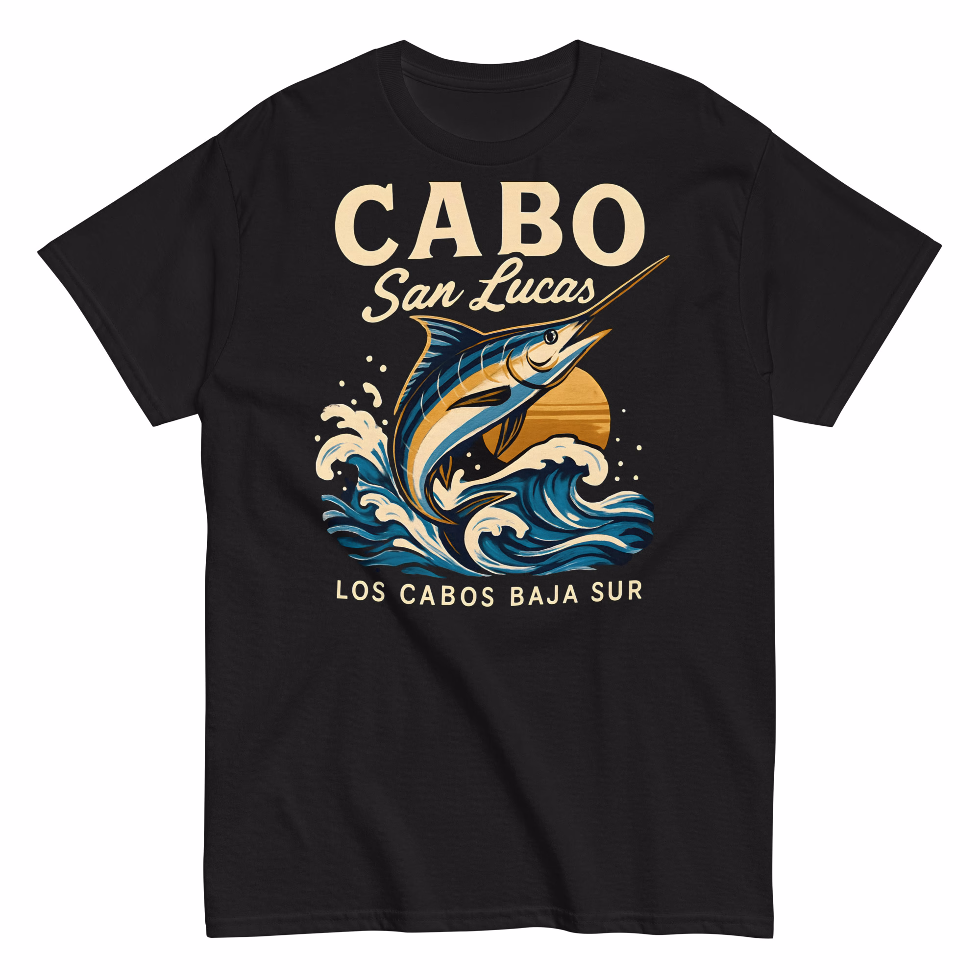 The Cabo San Lucas Marlin Fishing T-Shirt captures the adventurous spirit of Baja’s iconic fishing paradise. Featuring a detailed leaping marlin against crashing ocean waves, it proudly showcases “Cabo San Lucas” in stylish typography and “Los Cabos Baja Sur” beneath for an authentic coastal touch. With its vibrant blues and golden accents, this design pops beautifully on dark shirts — perfect for anglers, travelers, and anyone who loves ocean-inspired apparel. Whether you’ve visited Cabo or dream of it, this shirt brings the seaside energy with every wear. 🌊🐟