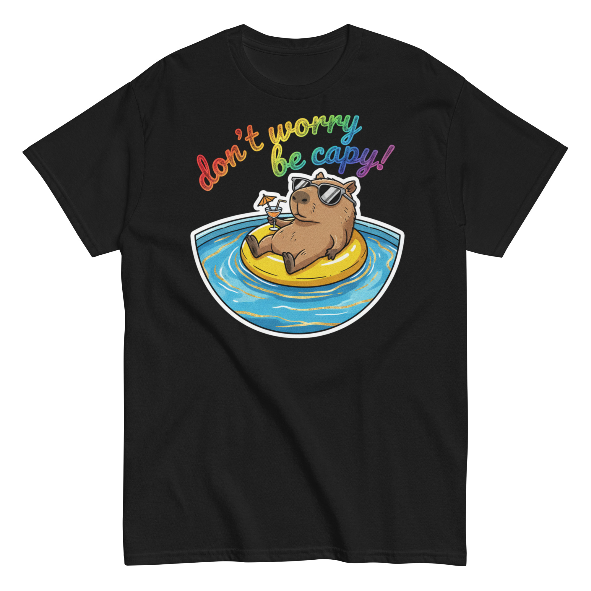 Spread good vibes with the Don’t Worry Be Capy Shirt – Cute Capybara Relaxing Pool Tee! Featuring an adorable capybara lounging on a yellow float with a drink in hand, this cheerful design pairs rainbow text with chill summer energy. The colorful art pops perfectly on a black shirt, making it the ultimate feel-good tee for animal lovers, capybara fans, and anyone who believes in keeping life calm, cool, and capy!