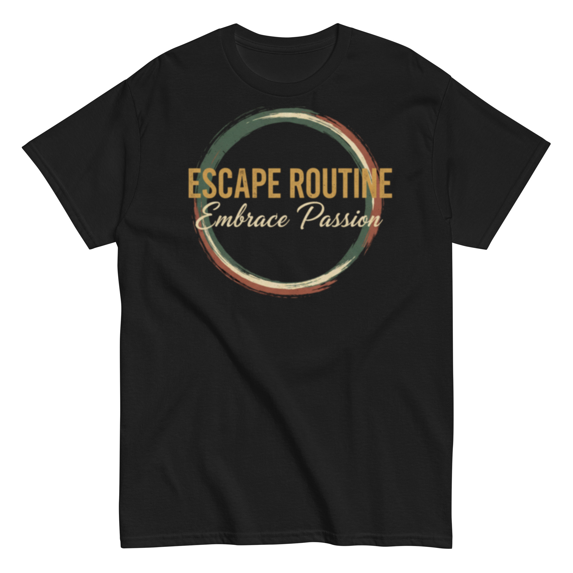 The Escape Routine Tee is a stylish reminder to break free from the ordinary and follow what sets your soul on fire. Featuring the inspiring message “Escape Routine, Embrace Passion” inside a rustic brushstroke circle, this minimalist yet bold design symbolizes balance, renewal, and purpose. The earthy tones of gold, green, and brown pop beautifully on dark shirts, making it perfect for dreamers, creatives, and anyone ready to live life with intention.
