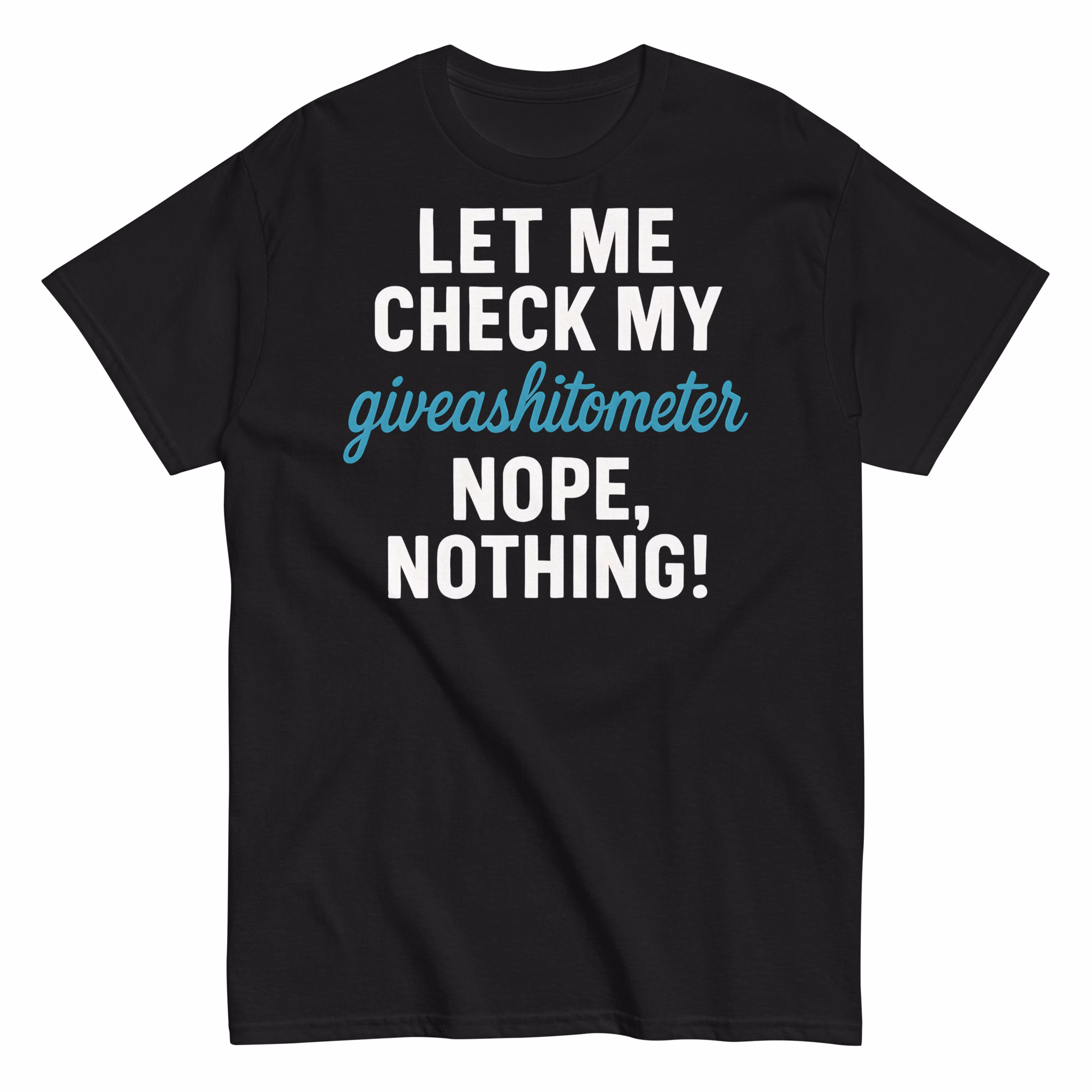 Show off your sarcasm with the “Giveashitometer” T-Shirt, perfect for anyone who’s mastered the art of not caring. Featuring bold block lettering paired with playful script in teal, this witty design stands out on a classic black tee. Comfortable and eye-catching, it’s the ideal conversation starter for casual outings, parties, or simply showing off your humor. Great for people with a sarcastic streak, this tee is a must-have for your funny t-shirt collection.