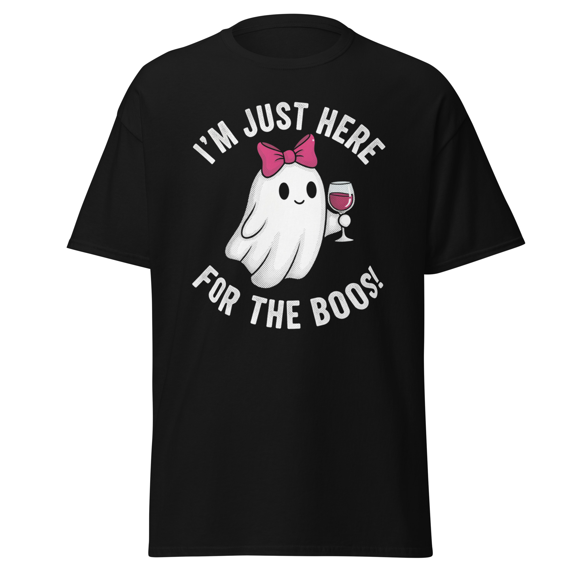 This funny Halloween shirt features a cute ghost with a pink bow holding a wine glass, with the phrase “I’m Just Here for the Boos!” A perfect spooky and playful tee for wine lovers and Halloween parties.