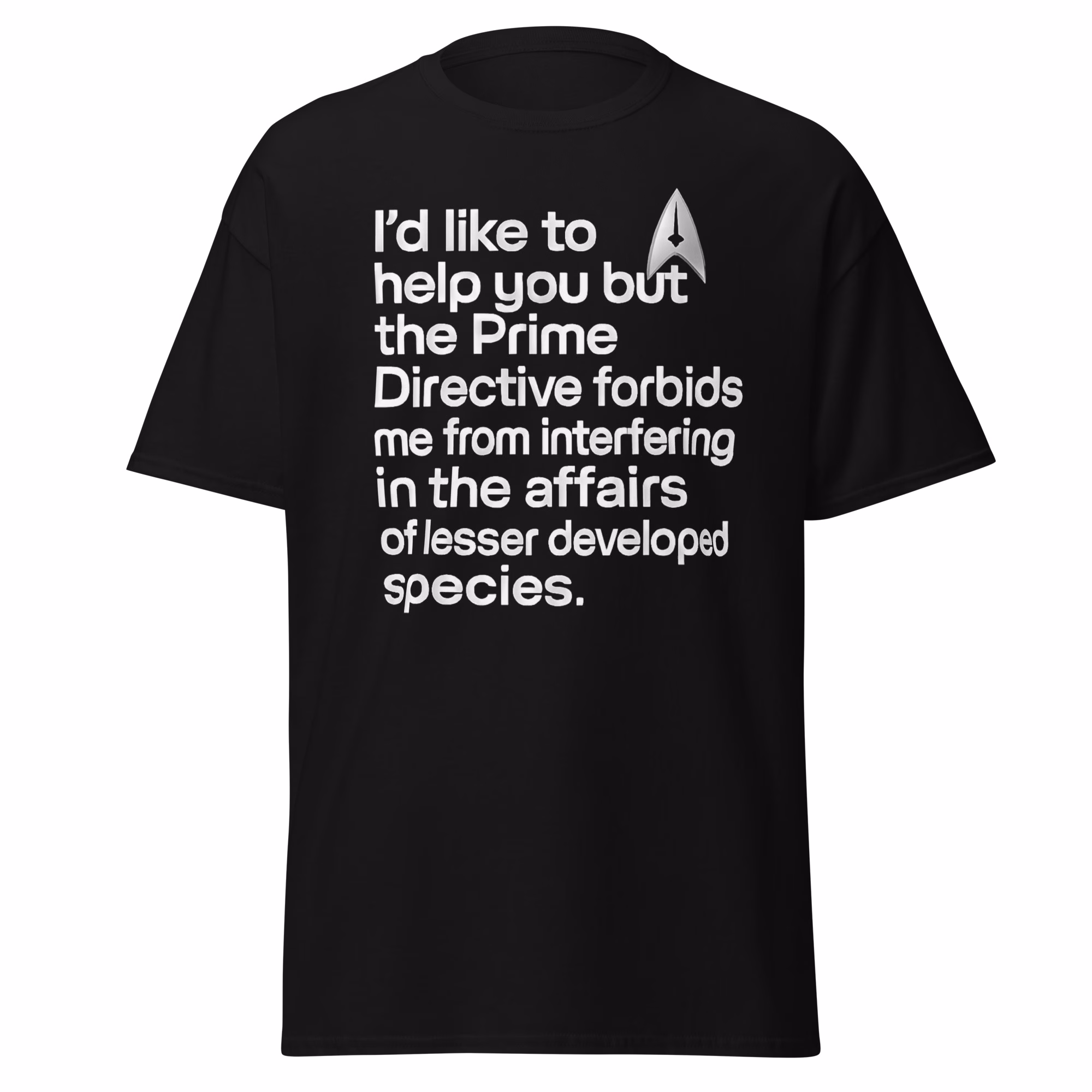 The Prime Directive T-Shirt features the witty sci-fi quote: “I’d like to help you but the Prime Directive forbids me from interfering in the affairs of lesser developed species.” Perfect for fans of geek culture and space adventures, this tee combines humor with a classic sci-fi reference.