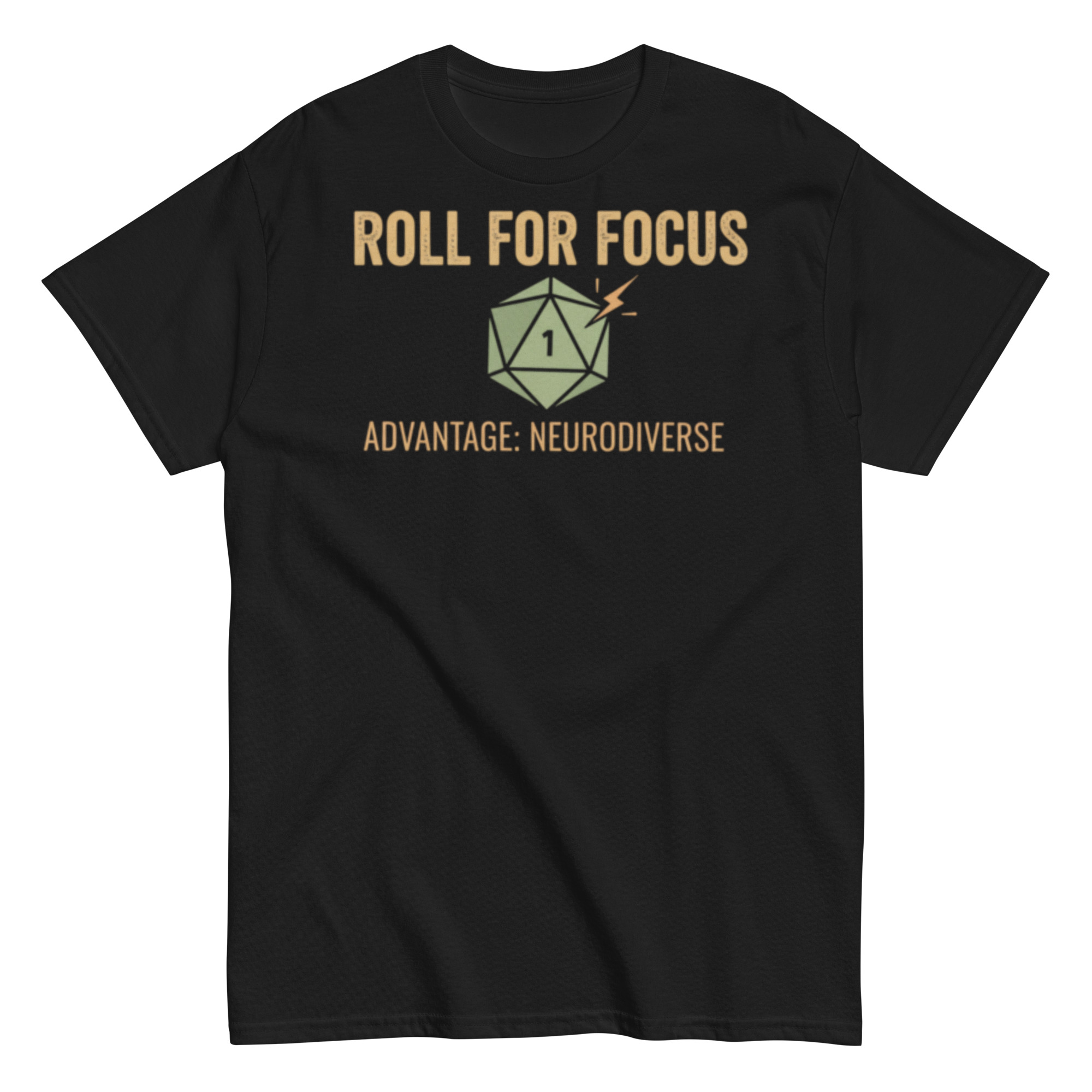 The Roll For Focus – Advantage: Neurodiverse tee celebrates the creativity and resilience of the neurodiverse community with a witty tabletop gaming twist. Featuring a D20 die showing a critical fail roll of “1” paired with a lightning bolt of determination, this design highlights that focus may come in unique ways — but so does brilliance. Perfect for gamers, thinkers, and anyone who embraces their own kind of focus with pride.