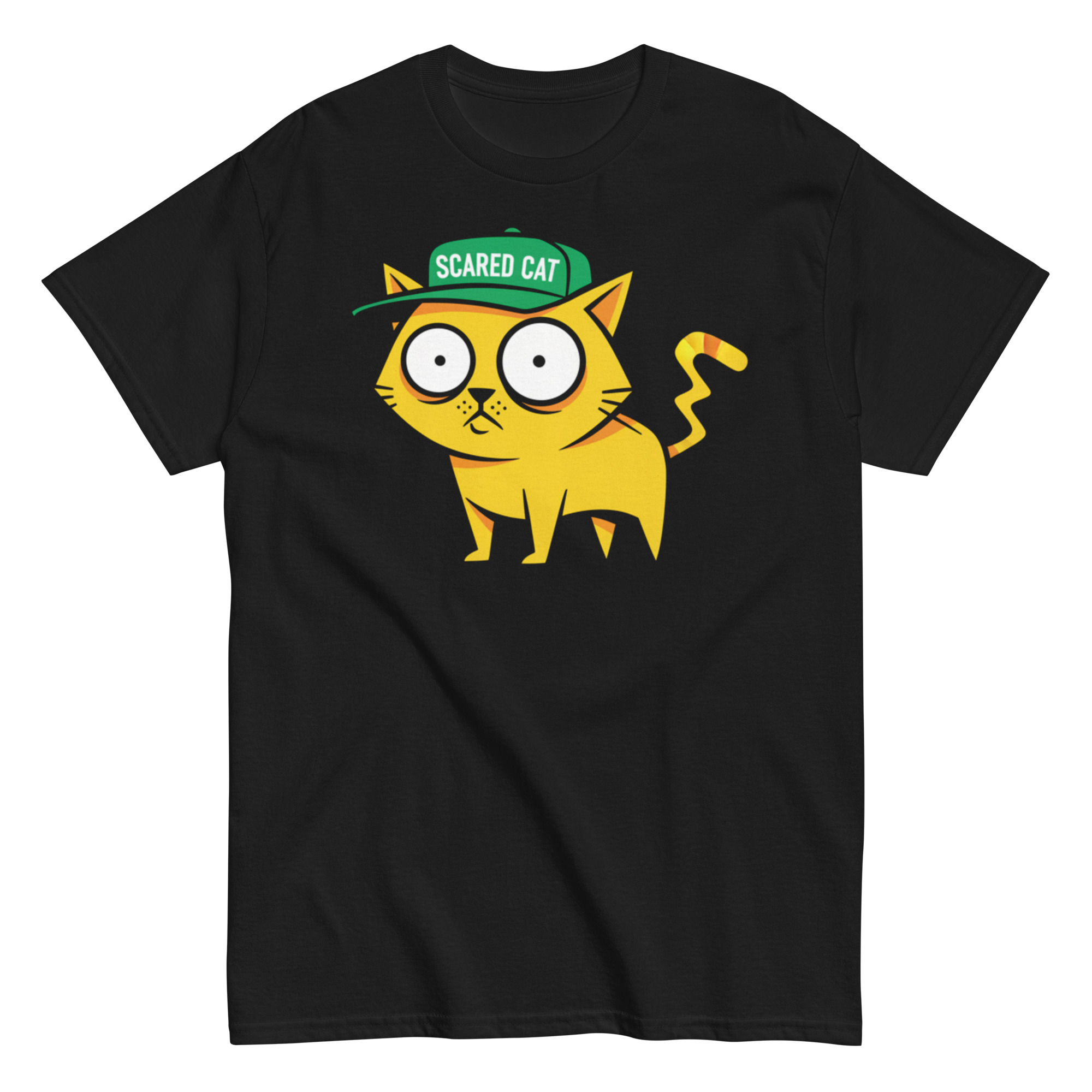 The Scared Cat Tee is the perfect mix of humor and personality! Featuring a cartoon-style yellow cat with a wild-eyed look and a hat that reads “SCARED CAT,” this design adds a dose of silly charm to any outfit. The bright colors and hand-drawn look make it pop on dark shirts, creating a fun, standout piece for cat lovers and fans of offbeat, funny designs. Wear it to show off your playful side and make everyone smile.