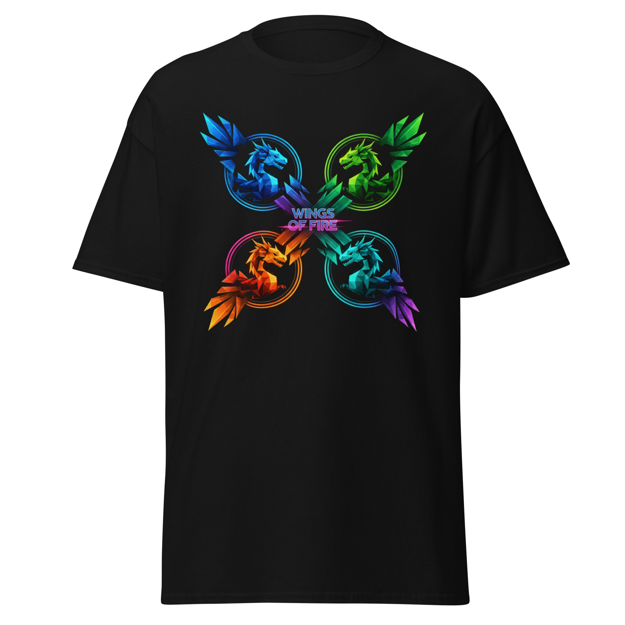 This fantasy tee features four vibrant dragons with the text “Wings of Fire.” A must-have for fans of dragons, fantasy worlds, and epic mythical creatures.